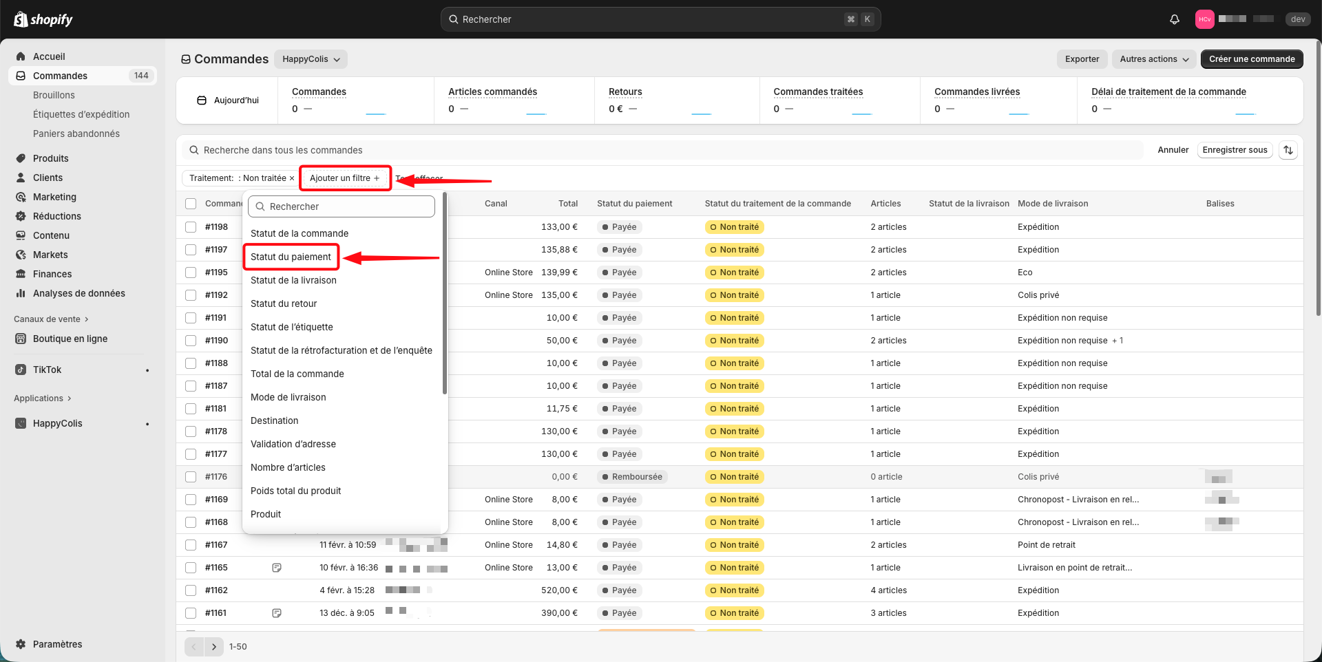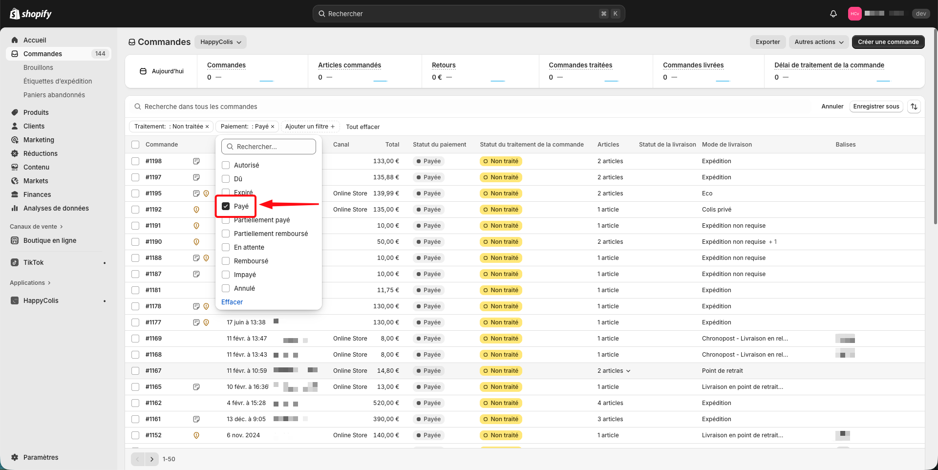 Pour retrouver les commandes concernées, créez une vue filtrée vos commandes avec les paramètres suivants :