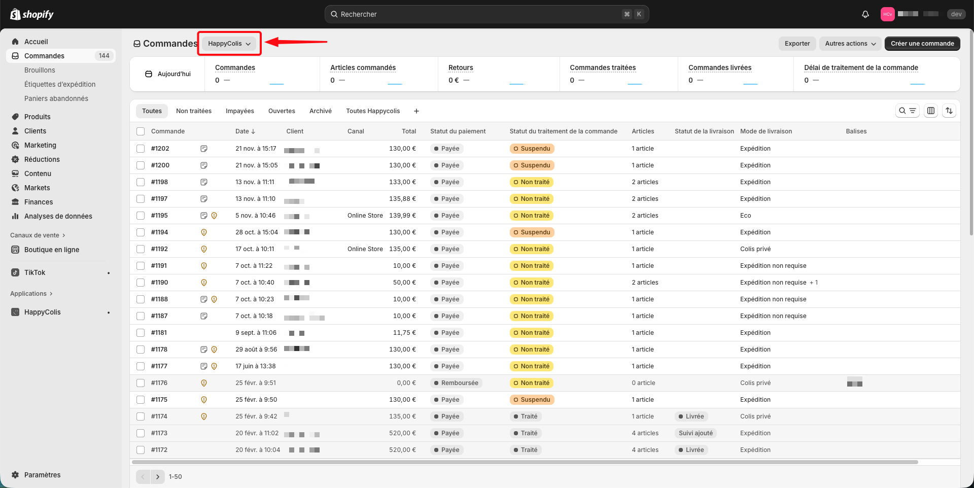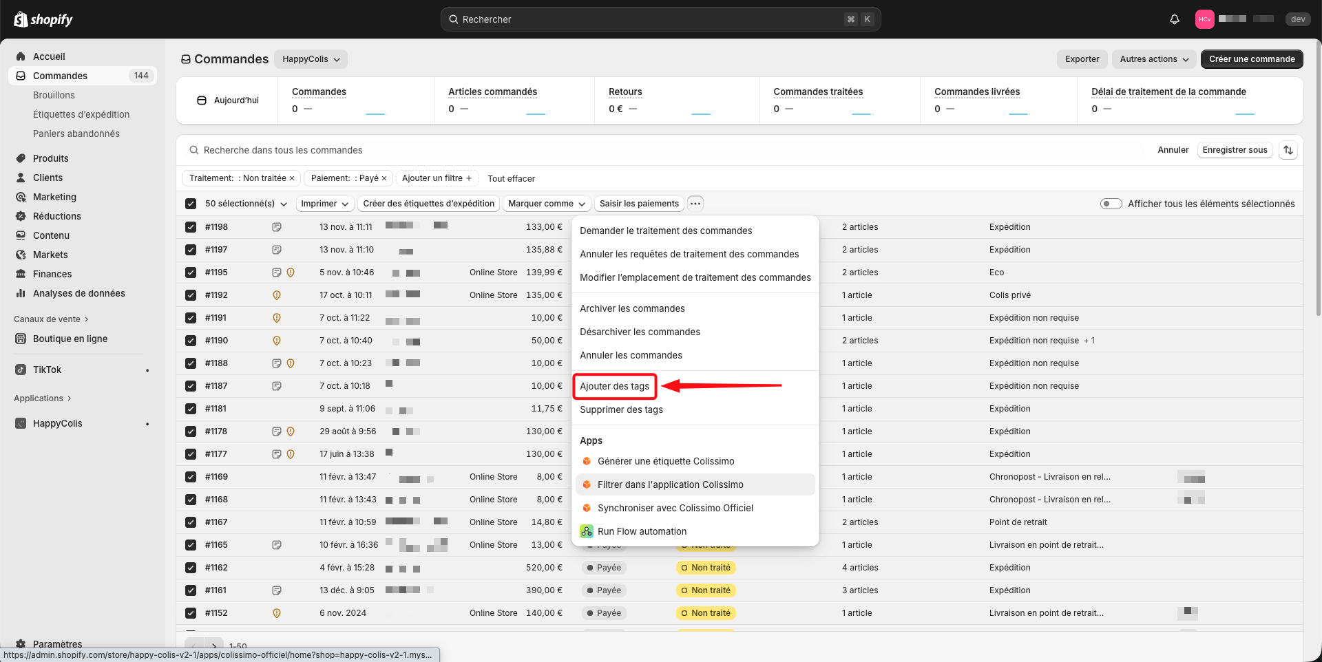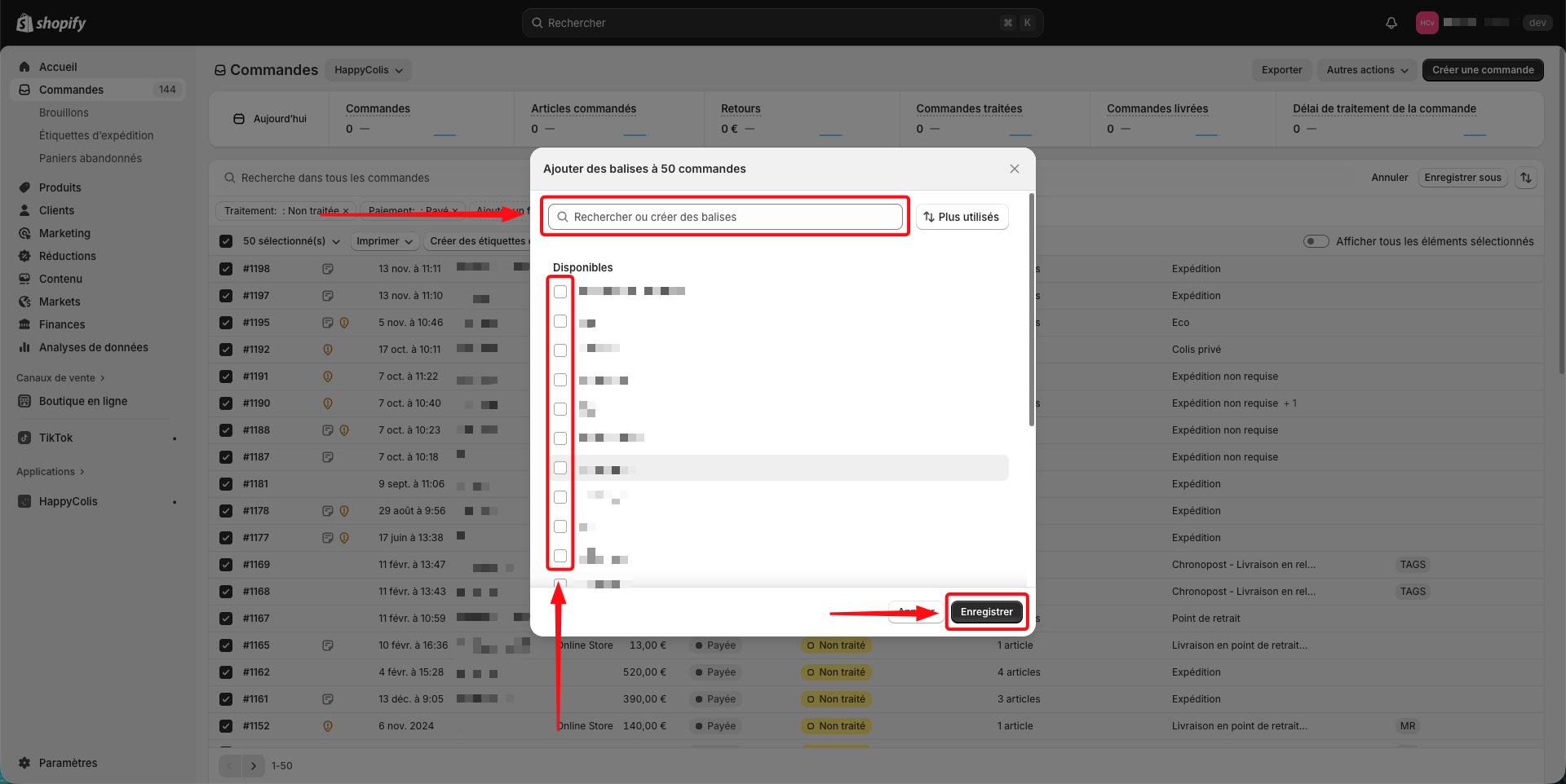 Une fois la vue créée, sélectionnez vos commandes à l'aide des cases à cocher situées à gauche du numéro de commande et ajoutez un tag de votre choix (exemple : "HC") :