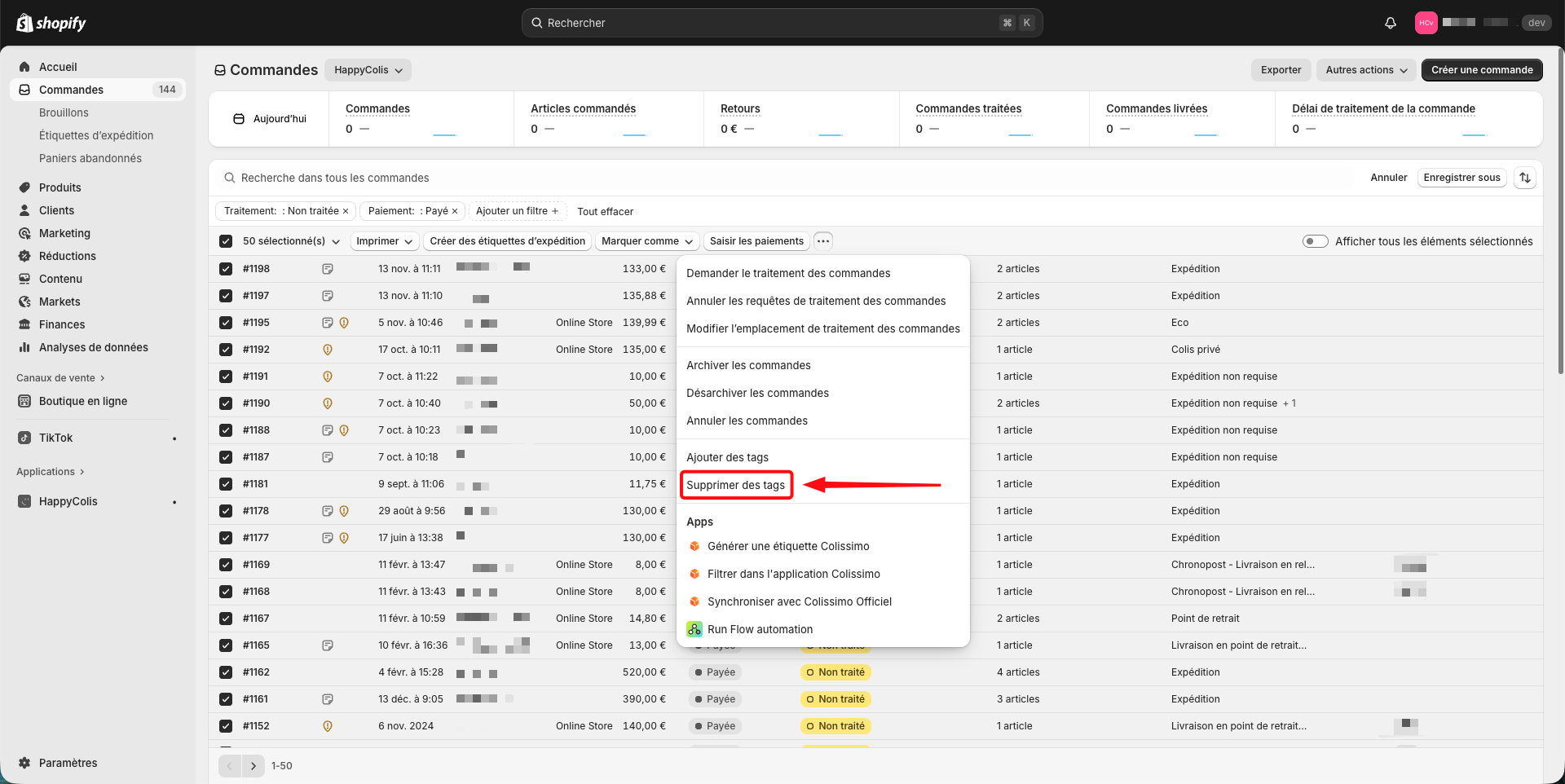 Une fois les commandes synchronisées, si vous le souhaitez, vous pourrez retirer le tag à l'aide de l'option "Supprimer des tags" ci-dessous :